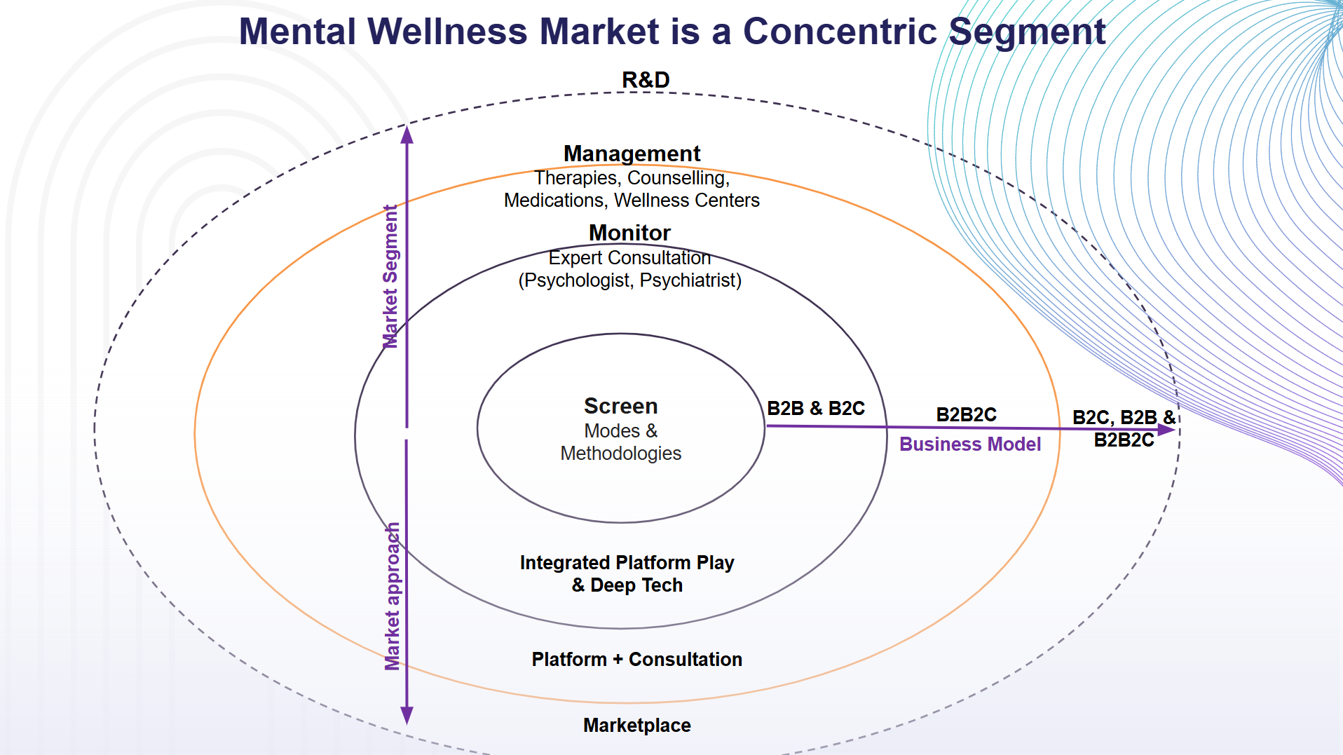 The mental awareness market segment in India functions like a concentric ecosystem where various layers coexist and support each other. This interdependency is critical to building an end-to-end platform that advances research and development in precision psychiatry and neurodegenerative remedies. Like other emerging industries such as fintech and agritech, mental wellness is rapidly evolving, marked by technology fragmentation yet immense opportunity. Technology-driven advances in deep tech, AI, and democratized digital access, especially via voice and facial recognition, are transforming screening and monitoring paradigms.